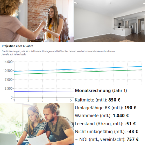 Simuliere die zukünftige Mietentwicklung auf Basis von Ausgangsmiete, Steigerungsraten, Indexanpassungen und gesetzlichen Rahmenbedingungen.
