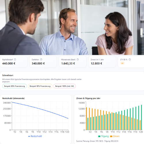 Simuliere Zins, Tilgung und Laufzeit, um deinen Kapitalbedarf und monatlichen Cashflow realistisch einzuschätzen.